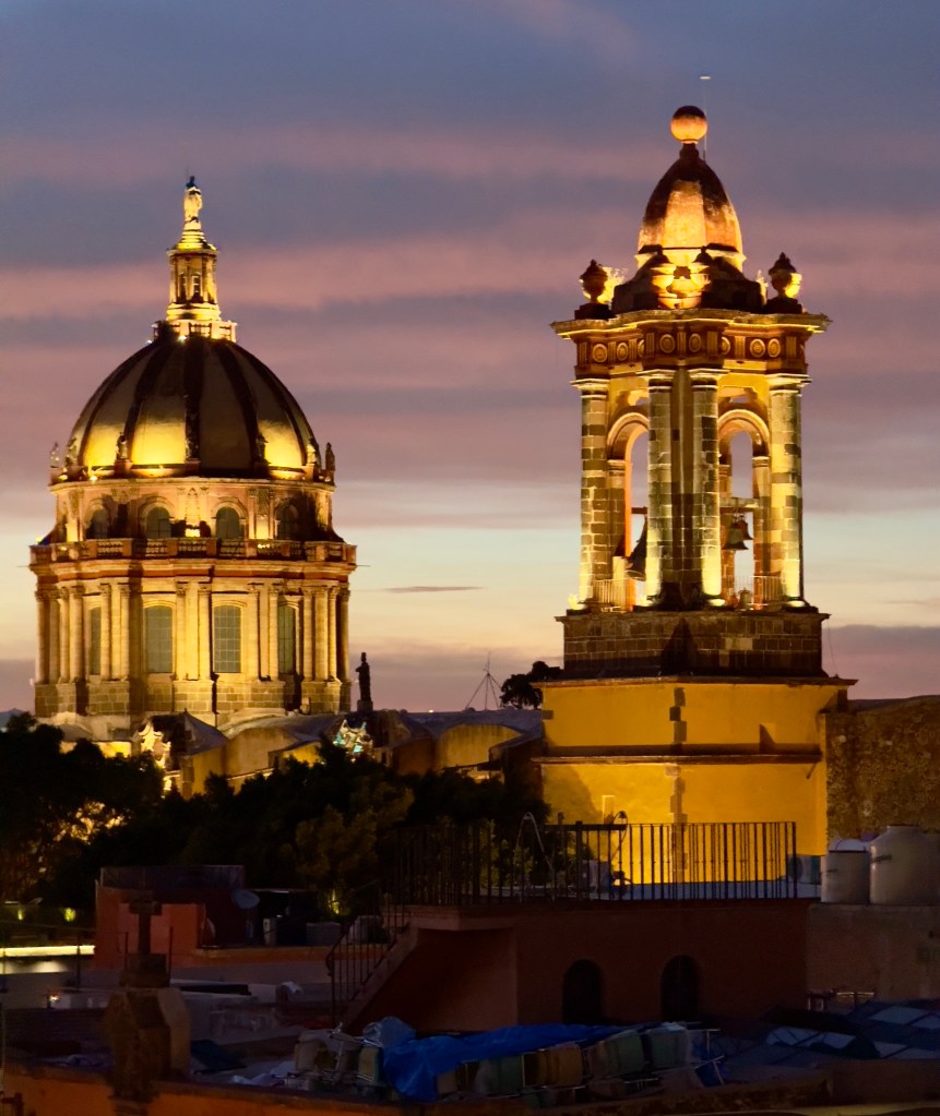 So at 5 p.m. I took a cab to 27 Hidalgo, to Casa Lool Beh, my airbnb, just above La Cabra Iluminada, a marvelous vegan restaurant courtyard which had closed at 4. According to the Airbnb instructions I would enter the code they sent me into a lockbox and get access to keys to get into the building. I entered the code but the lockbox wouldn’t open. I tried it several times. No luck. Then someone walked out the door, which was the door to the restaurant and I pushed my way in. At the top of the steps were two more locked boxes. I entered the code in each and nothing happened. Finally I wrote to the airbnb telephone number, waited for a while, got a reply saying the code number was enclosed, but in spite of clicking everywhere on the message, no code number appeared. Just then I got a message from Martha that the group was at a downtown restaurant where we had planned to meet. So I lugged my knapsack and carryon downstairs and trundled up a block to the rooftop restaurant where we had a marvelous view of the red sunset, which happens nightly, since it never rains here in January. I got another message from the airbnb, claiming to give me the passcode, with none in sight.