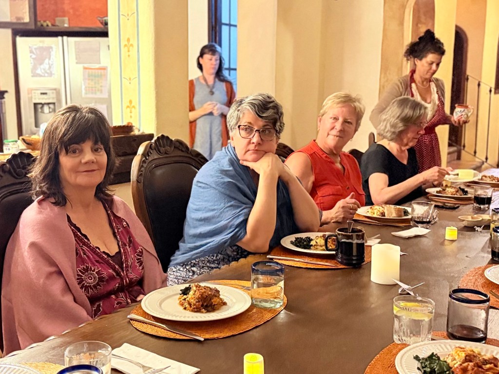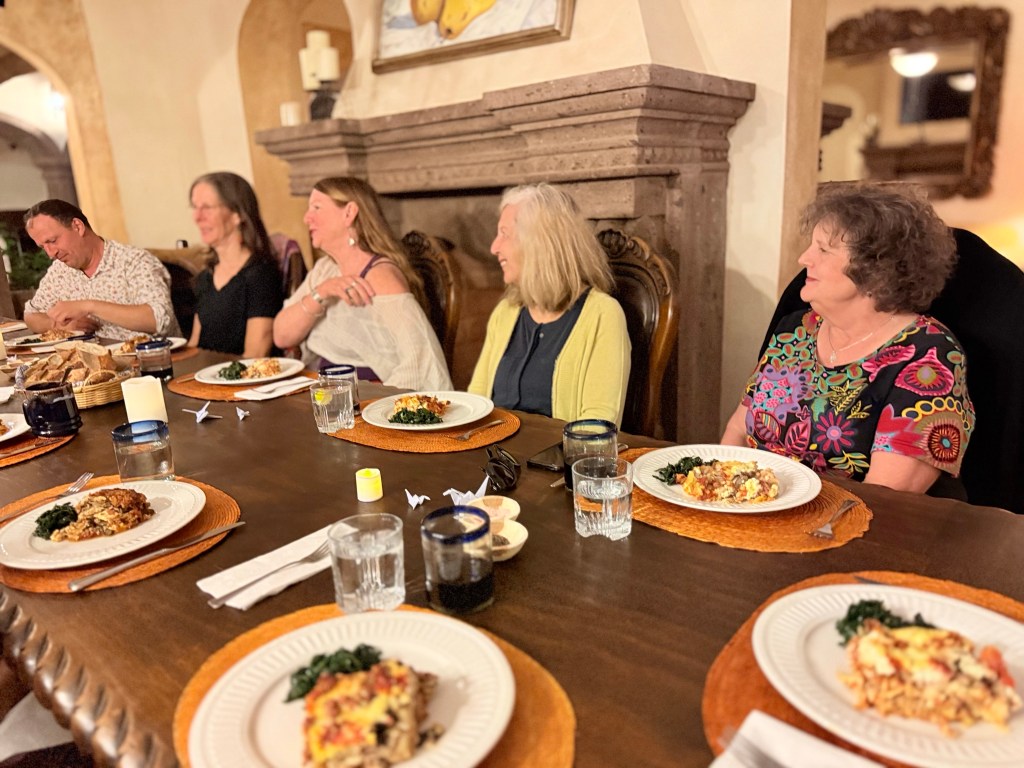 The last evening of the yoga group’s stay was bittersweet. Everyone had had a marvelous time with little gifts for the hostesses and a wonderful lasagna meal with a fancy birthday cake for Martha’s upcoming birthday with everyone singing happy birthday.