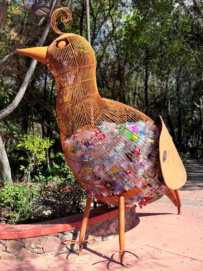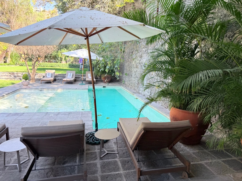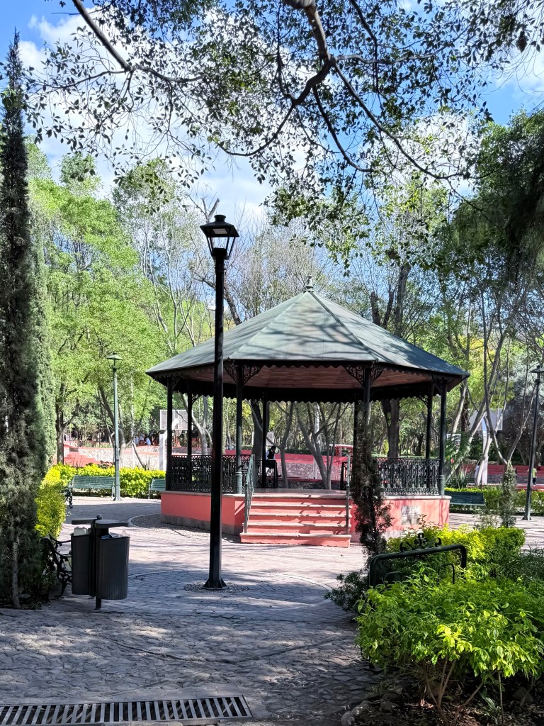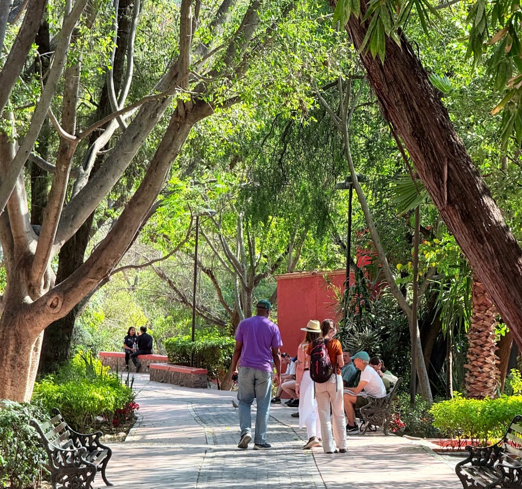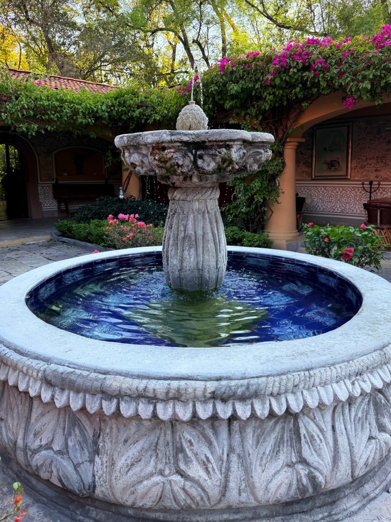 On our last full day in San Miguel de Allende we walked downtown for lunch on the La Azteca rooftop and then walked down to the large park in the center of San Miguel to a luxurious hotel where we walked through the garden and saw peacocks strolling and and a last luxurious drink in the courtyard before heading back to our house to pack.