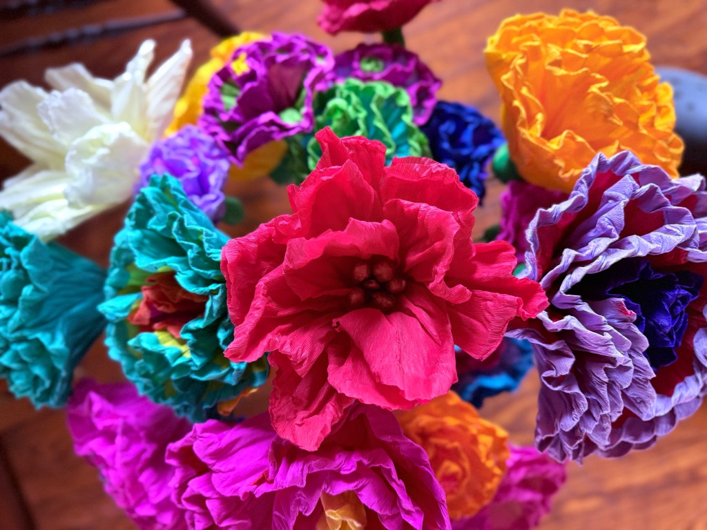 I spent the day at home unpacking my treasures from Mexico, brilliant paper flowers and solemn Virgins of Guadeloupe. But at 5:30 p.m. Susie was in town and we joined my son, Tom, and his wife, Kathy, for Valentine’s Day drinks at 5 Walnut Street in Asheville where there was a live band which I filmed and am putting here. And then Susie, too tired to drive to Marshall, and I went out to eat at a Thai restaurant and then she spent the night here.