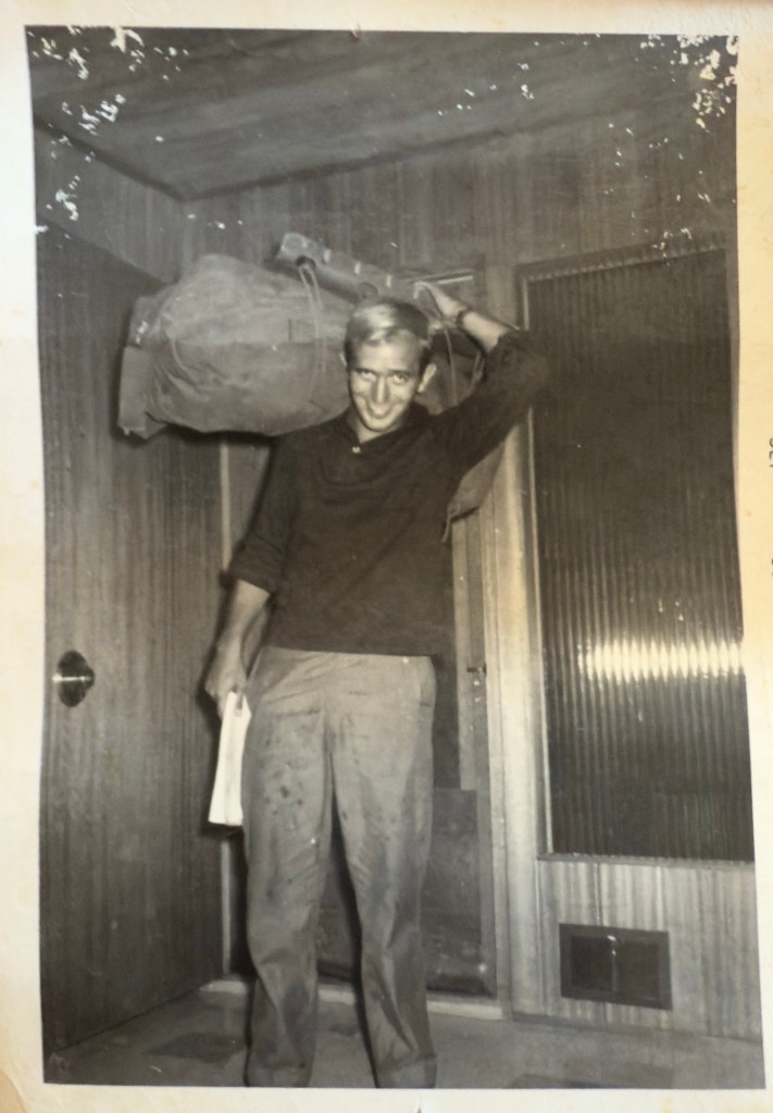 The photograph above is me returning from hitchhiking for the summer of 1959 after graduating from Wooster College, once around the United States from Ithaca, New York, where my parents lived, across the country to San Francisco and then up to Seattle and back along the northern border to New Hampshire and then back to Ithaca. It was a leap into the unknown. I had the addresses of a few of my parents elderly relatives that I might spend a night with and a friend, Ray Smith, who was building a house outside of San Francisco whom I wanted to help build for a month. But otherwise I was clueless. The first night I left the thruway, walked into a woods in a light rain, and tried to sleep with a tarp over me, woken again and again by some animal walking around and sniffing.