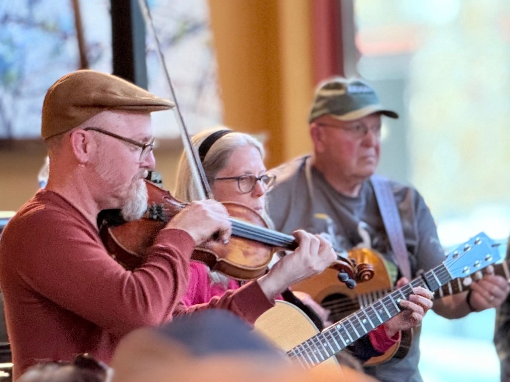 The same group of about twenty musicians were there, mostly playing the guitar or fiddle, but this time there was also a piano player who pounded out marvelous tunes. People got up to dance. A lot of people talked over the music, but the point of the evening, for the musicians and the audience, was to have a good time to the beat of the music. This is one of the things I came to Marshall for. Even though I am an outsider I felt welcome in this mountain community where people gather to enjoy themselves in each other’s company.