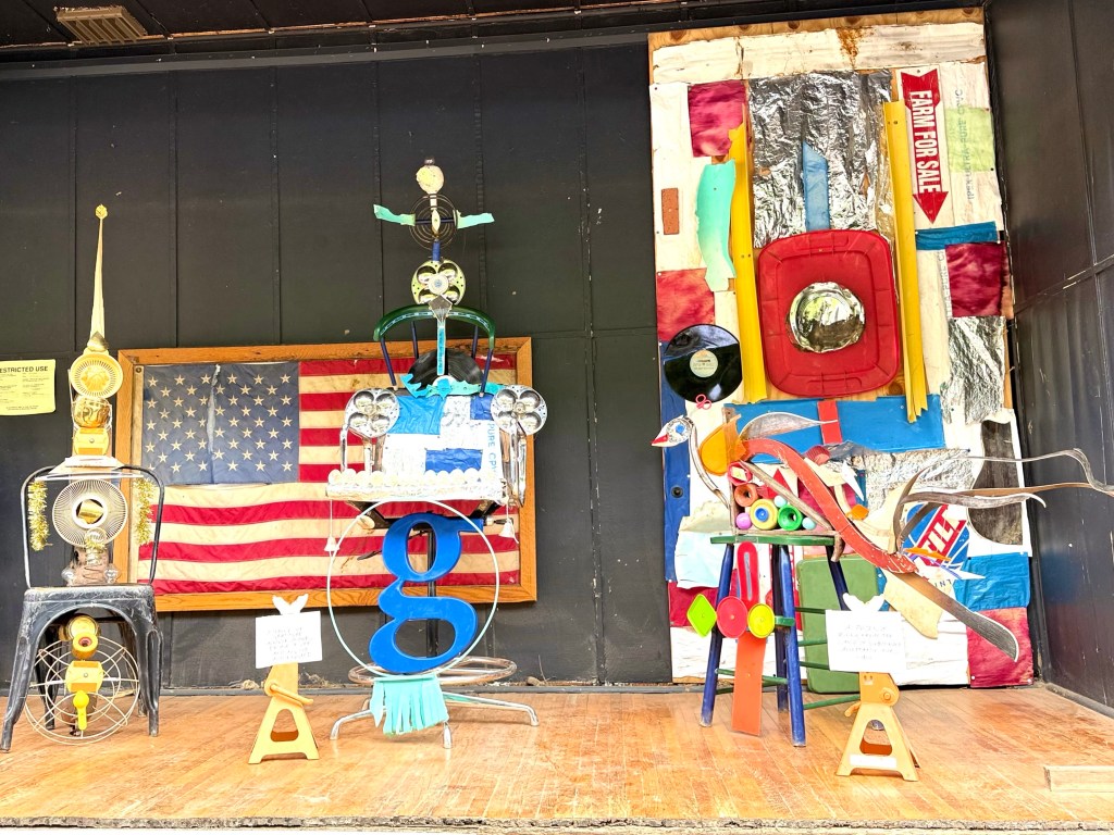 Susie made three installations of trash that she had found along the French Broad River after the flood which she put in the washed out window of the still unrenovated Madison County Arts Council.