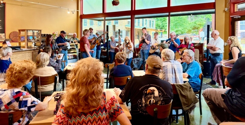 On Thursday evenings a group of people who like to play bluegrass together meet in Zuma’s Coffee House and perform from 6 to 8 p.m. A large crowd, mostly older people, who love this traditional fiddle music with banjos, guitars and mandolins, fill Zuma’s. The atmosphere is electric. Often people get up and dance, not contemporary dancing as at Zadie’s but mountain clogging dancing. It is wonderful.
