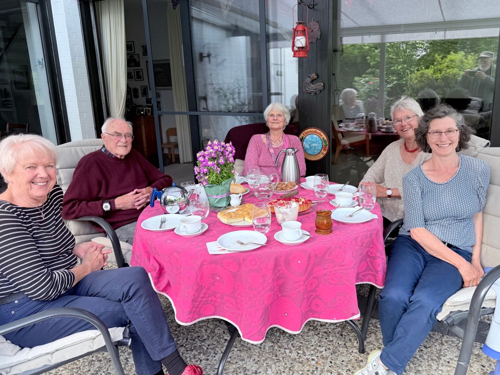 Today three sisters, daughters of Herr Reineke, who taught with Kathe’s father, whom Kathe often mentioned, came to Winsen from other parts of Germany to visit and to care for their father’s grave. For a couple of hours I listened to their stories about growing up in Winsen, only half understanding their German and what they were talking about. For some reason the world they were talking about sounded like a Jane Austen world of details about gardens and the shape of houses and friends they remembered. We sat at a round table and had strawberries on a store bought cake and almond and sugar covered Streusel Kuchen while drinking tea and coffee, the German obligatory teatime when anyone comes to visit you in Germany.