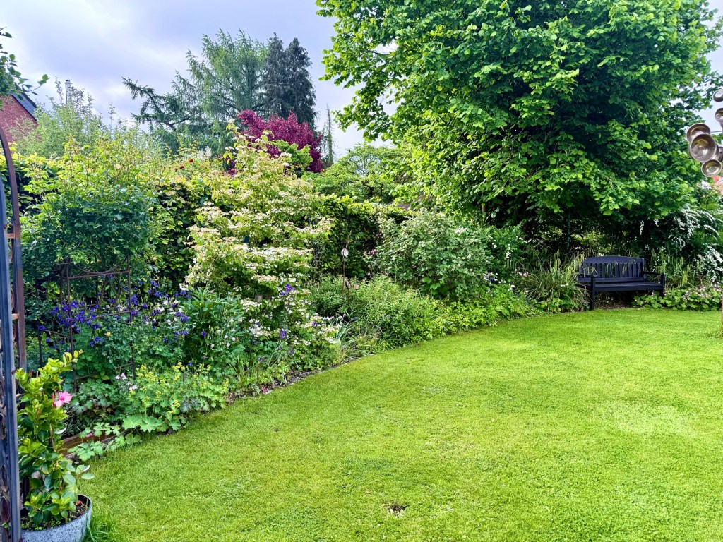 The house that Elke and Heinrich live in has a beautiful garden and a carefully manicured lawn without a weed. The neighboring house is only 30 feet away but there is such a high shrubbery fence between the two houses that it hardly seems to be there. But as we sat together through the shrubbery came the sounds of a family gathering, a great racket, in the garden next door. And from the back of the garden through another high shrubbery fence there was a symphony or frogs croaking, a strange coughing sound and a chorus of bird songs from a small pond in the garden. So we were completely separate from others but completely immersed at the same time, but able to shut out intruding sounds. One of the things that Elke has found strange in the USA is the lack of fences around houses, one lawn melds into the next and while houses are farther apart, what is happening in one yard is visible to everyone else.