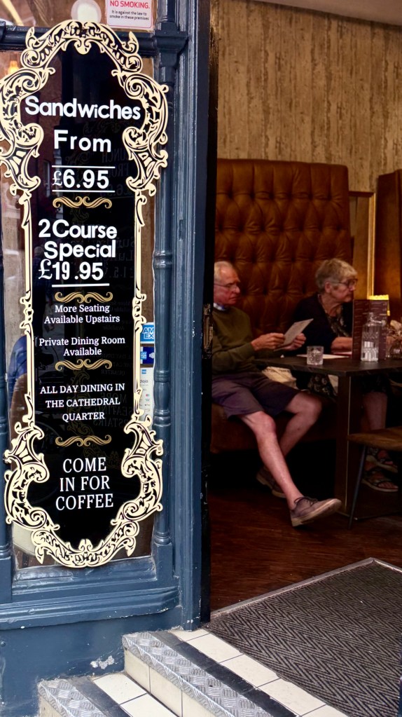 Our first day in Riseholme, on the edge of Lincoln, we went with Tina and Martine into the center of Lincoln and had lunch at the Duke William Hotel. I had fish and chips with mashed peas and mashed potatoes and gravy and then we walked around the center of Lincoln near the cathedral for a little while and then came back for an afternoon of talking.