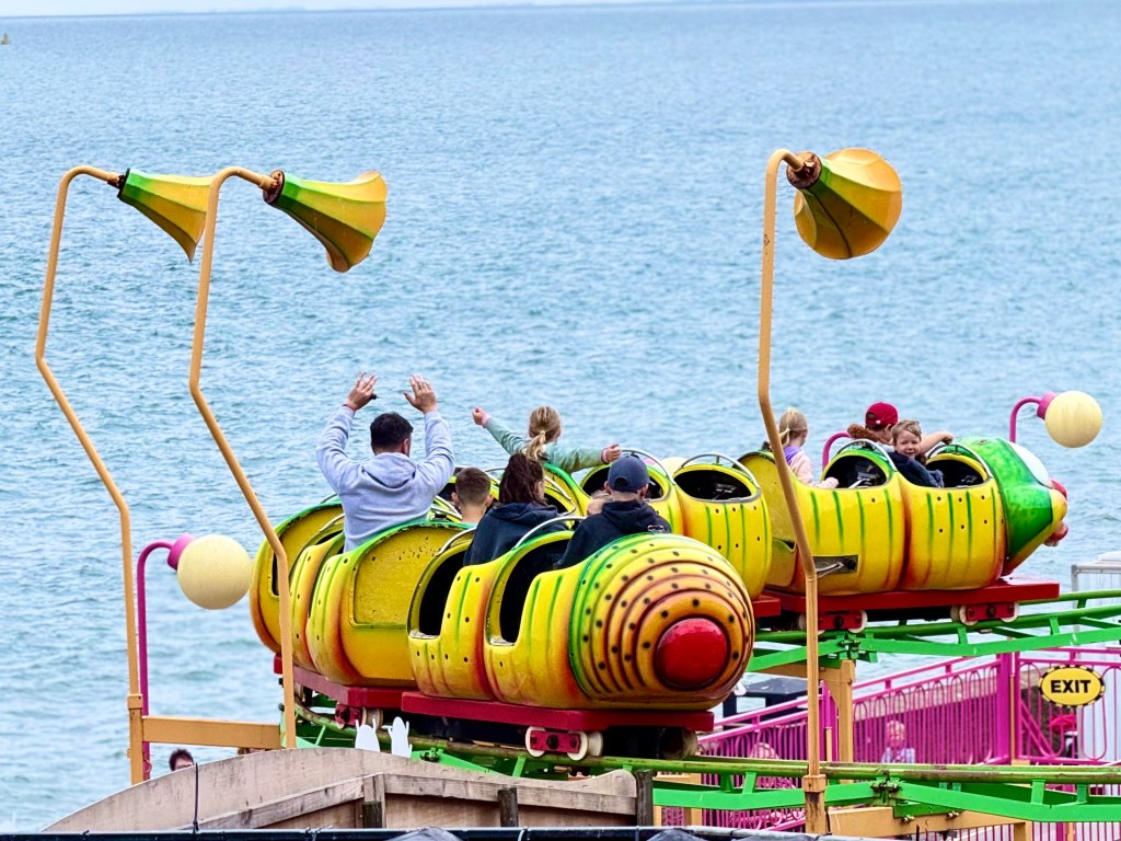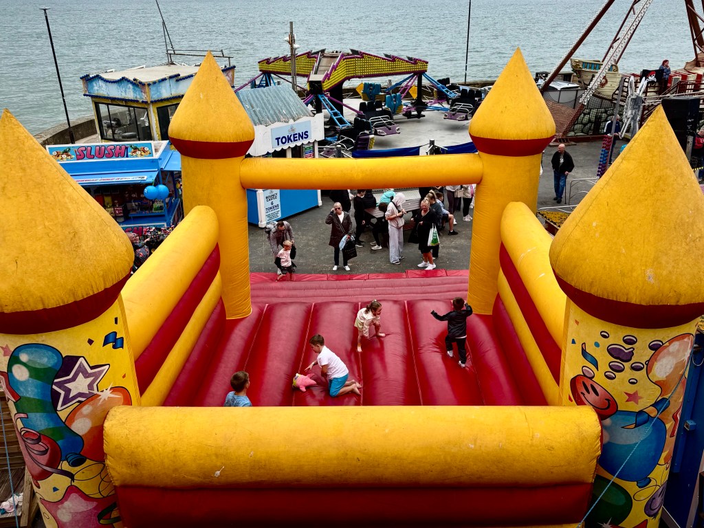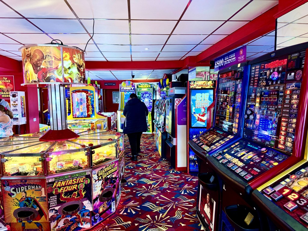 We drove first to Bridlington, a seaside vacation village for the masses, not the rich. Factory workers would save all year for a week’s vacation at the seaside, hoping for sunshine,but usually finding chilly weather and rain and then, because the beach was too cold, would spend their week on rides in the amusement park on the beach or playing arcade games. Sure enough, Bridlington was cold and drizzly. We walked on the promenade along the beach where a narrow fifty yards were to be watched by a life guard with no life guard or swimmers in sight. And then we played a game in which you deposited 2 pence pieces into a slot, trying to nudge a pile of pennies over an overhand where they would drop as winnings which you could continue to play with.