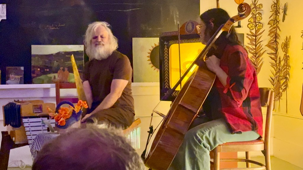 The second was at Primerose’s tea tent in the Marshall artist studios. After Primrose did a Crankie show, which I show here, a young woman sang softly accompanied by an older man who a played haunting sliding wailing sound on a wood handsaw with a violin bow with the bend of the saw changing the notes. And then, even more improbably, he got a similar sound out of a xylophone by pulling the violin bow over the ends of the flat metal bars that are usually tapped on.