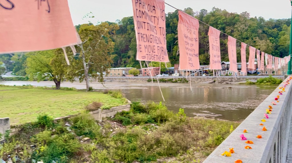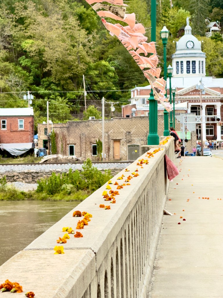 In the middle of the night Susie laid a line of marigolds all along the wall from one end to the other on the side of the bridge that connects Marshall to the artist’s studios on the other side of the river. Before the flood beautiful lights on high poles lined the bridge, but the flood waters sent trees and trash over the bridge, washing away half of the metal poles. But the bridge held and the marigolds were in remembrance of that day. Now the river below is shallow and it is easy to wade across. Along with her marigolds were prayer flags in pastel colors on which people had written their reaction to the flood.