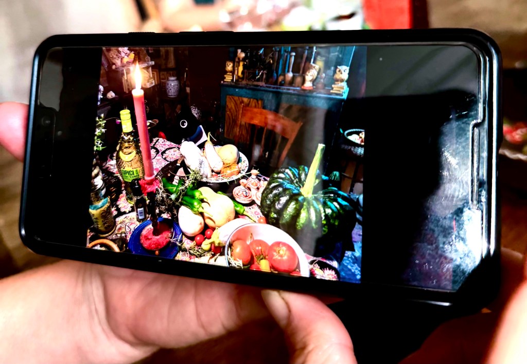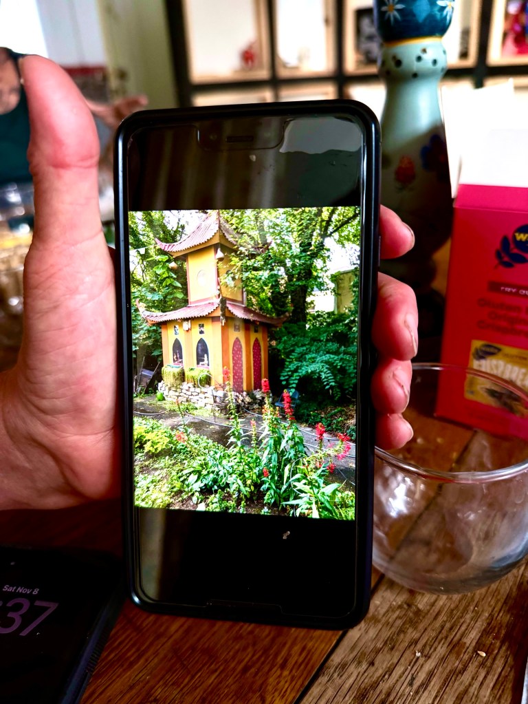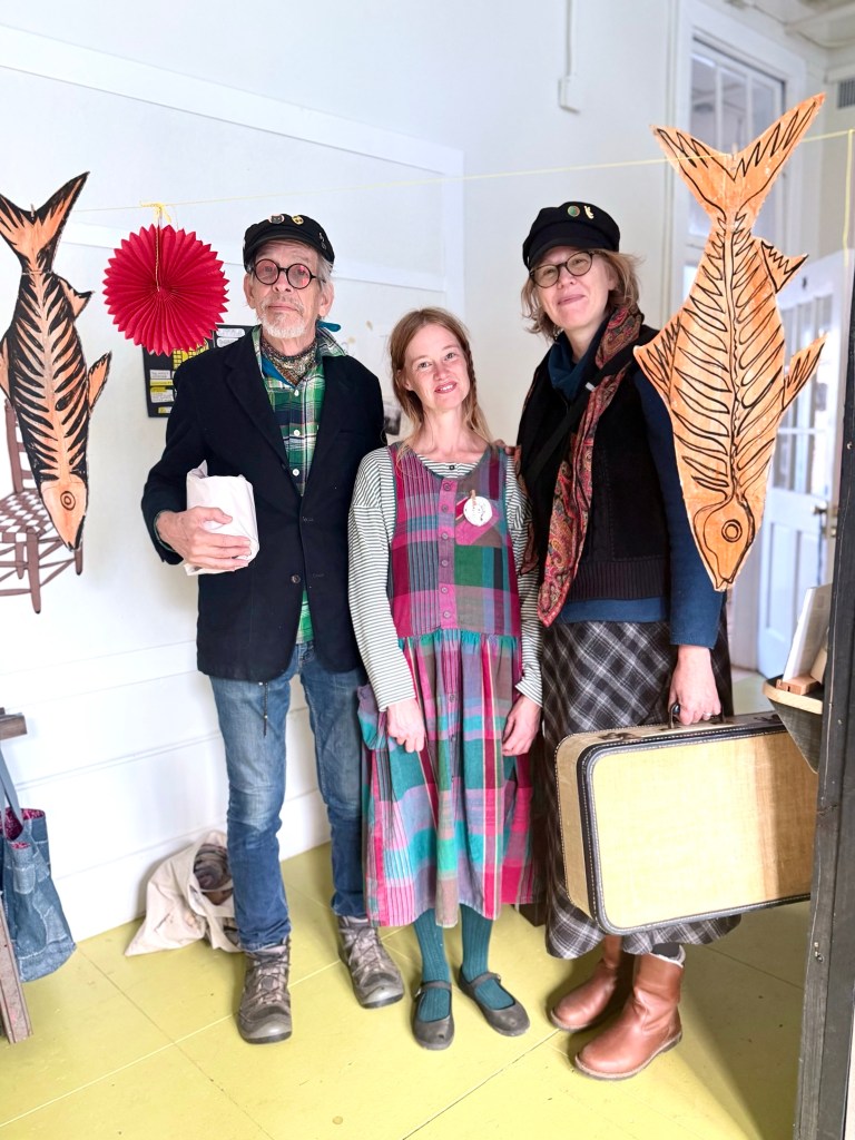 This afternoon I met Susie at Primrose’s tea tent in the Marshall Studios. I got there just after closing time at 2 p.m. but a group of people were having a picnic in the tea tent as they told stories. A man and a woman from Baltimore were on their way to the Campbell Folk School near Asheville where they were going to do a Crankie workshop. But it was the home of the man that was most interesting to me. He lives in what has been a rundown, non gentrified area of Baltimore and two connected Brownstone row houses which combined have 19 rooms, each room of which he has decorated in a particular style and filled with restored cast off furniture. The Mayan room has all the walls painted as stylized jungle. He was eager to show us the photos on his phone of his rooms and has invited us to stop by on our way to Rehoboth Beach in February.