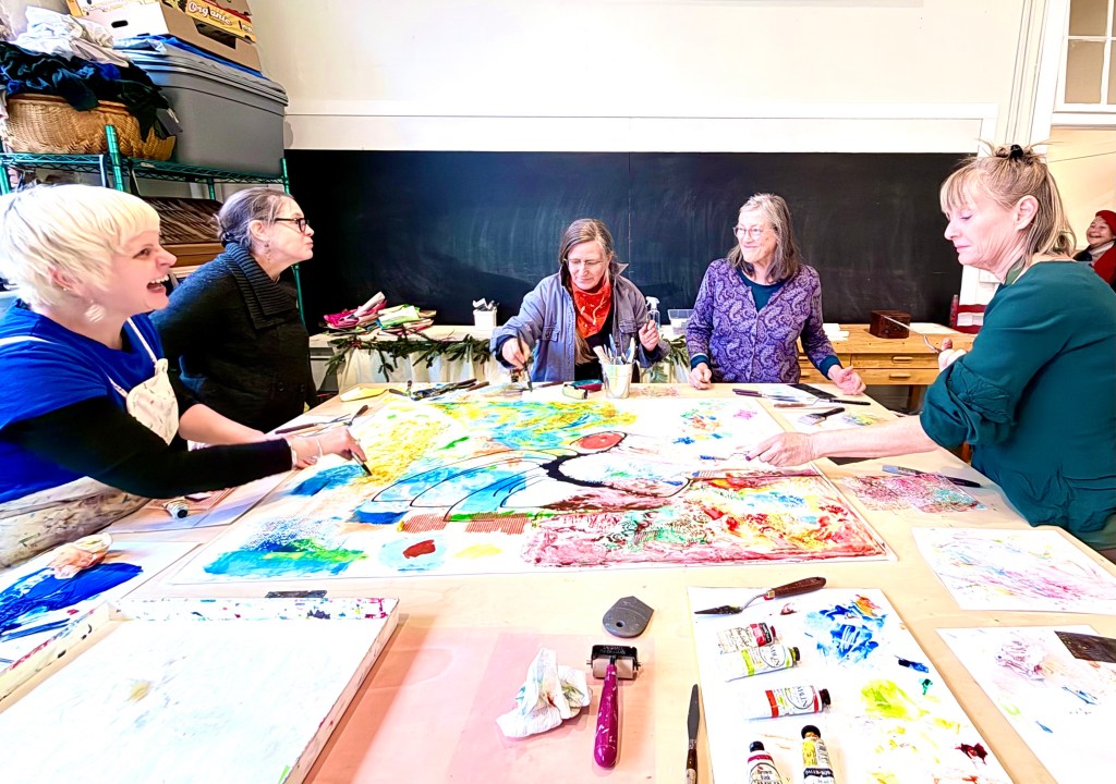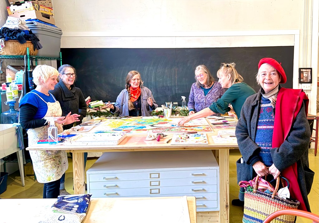 After a year or rebuilding after Helene flooded Marshall every week brings more and more community activities of one kind or another to Marshall. The Marshall Highschool Studios with all of the first floor flooded and people moving out of studios a year ago is now completely occupied. Today Susie called me over for the short walk to see what a small class of women learning to do cold wax drawing and painting had produced. They were having a great time, talking as they explored the new medium and eating snacks. It was fun to be in their presence.