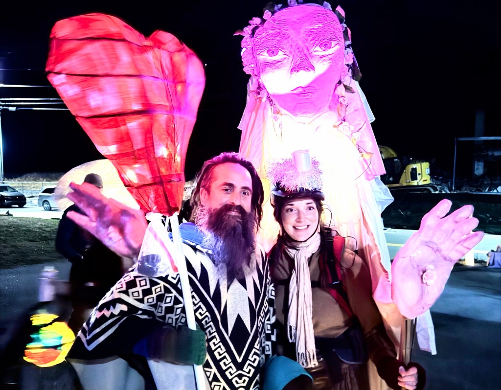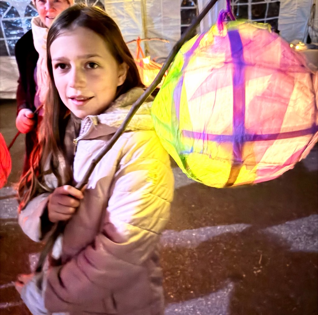 There were workshops for children and adults on lantern making leading up to the night of the parade so there were more than 100 people who showed up on a cold but clear night with their lighted (digital lights) lanterns. After a pep talk at the First Presbyterian Church parking lot the parade, led by a giant star, walked the length of Main Street and back to the church, singing as they walked.