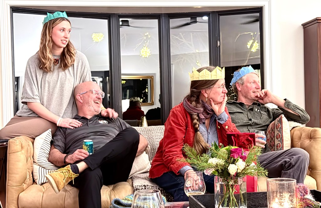 Again we have gone back to each person being designated to choose for one person a present which we opened slowly with great ceremony. Then my son Tom passed goofy presents which he had found in thrift stores. Caroline, the future doctor, was given a box of plastic body parts to be inserted in a kind of ghoulish game. I was given a white jacket of the Cali-Life Malibu Social Club.