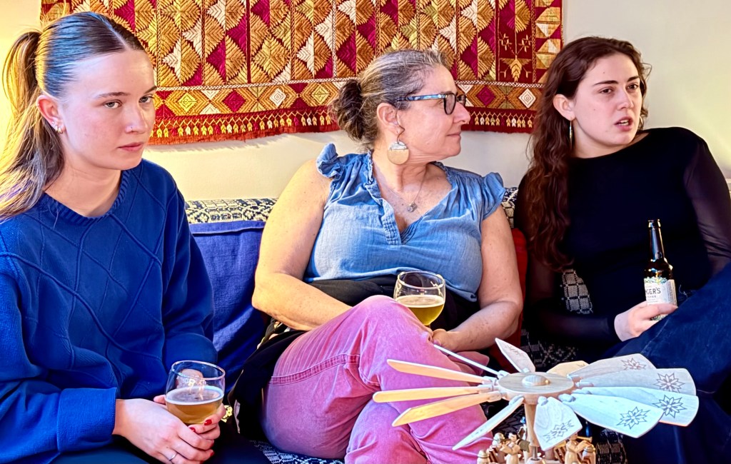 In the late afternoon my son Tom and my grandaughters brought there friend Sue Hanlon and her daughter, my granddaughter Hannah’s best friend since childhood, Ginger, to my new apartment. But shortly before that my friend Sheldon, a member of our Friday old man’s group, announced he was bringing his daughter, Felice, and her husband and son over at 1:30 pm. So on my first day as a host two groups were coming. Susie also came and Todd for the second group and we had a great time. Susie and Felice were childhood friends at Warren Wilson College. I had bought snacks and had some left over from my brother’s visit and was a little more confident this time. I had wine and beer which we didn’t drink. Mostly we sat around and talked.