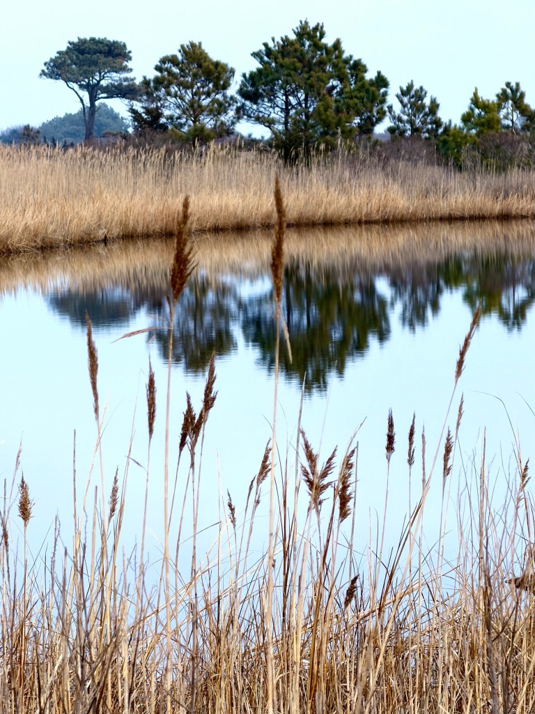 One of the high points of each reunion is going with John, an avid bird watcher, to Gordon’s Pond, a bird sanctuary where flocks of snow geese and other birds stop during their migrations north or south. This year the bond was still with the only birds being a few black ducks far in the distance. But the walk was beautiful. I was as interested in the patterns the dried grasses made as in birds so had a good time photographing the scenery. We did see one line of snow geese far above us as they headed to parts unknown.