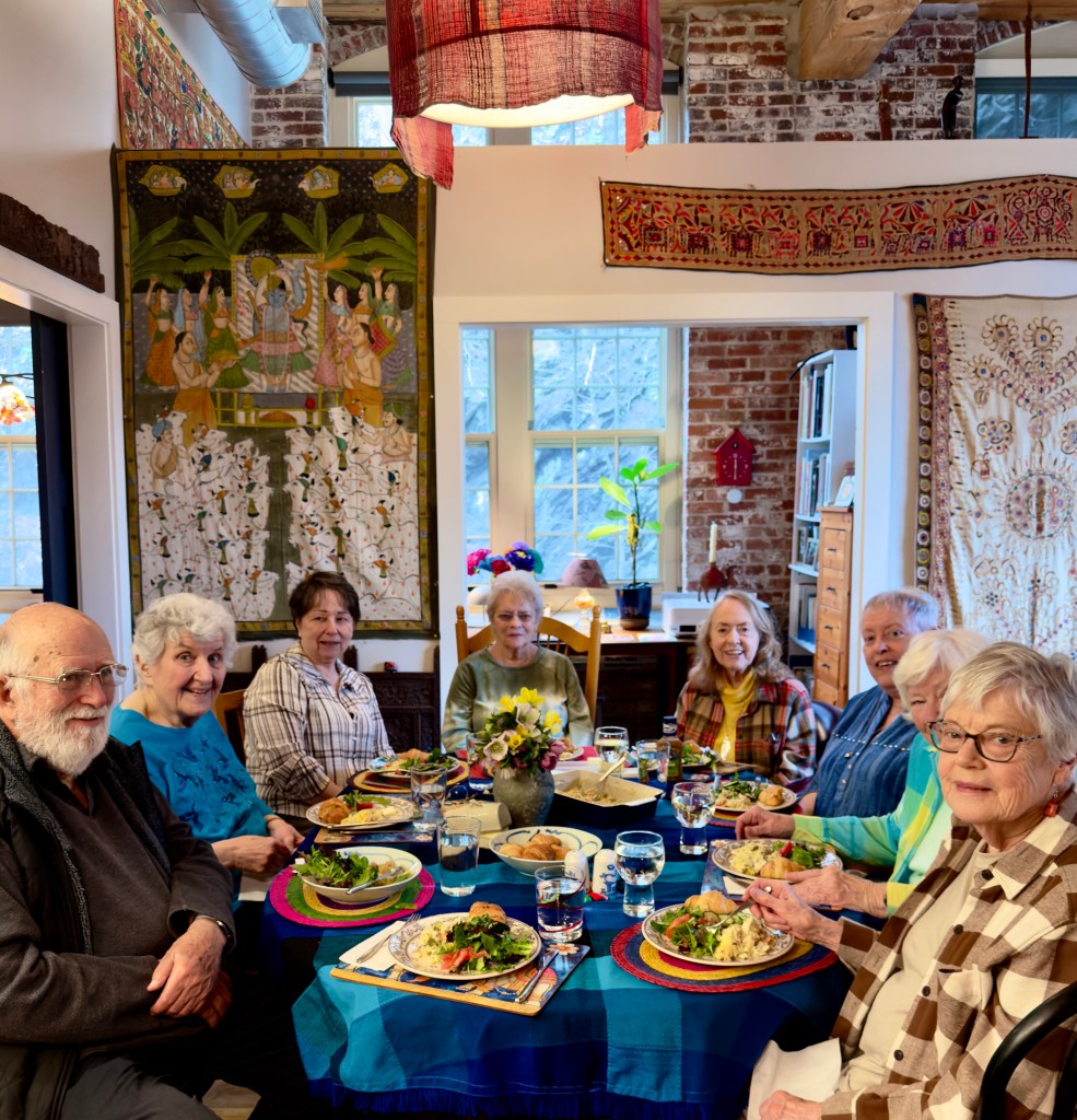 The first church ladies showed up with their canes and walkers at 11 to heat up their casserole. We had a great time sitting around and talking. At 12 we sat around my long dining room table, one large extension added, and just enough room for my new Mexican table cloth with Mexican and Sri Lankan place mats and thoroughly enjoyed ourselves. At about 2 p.m. they went home after helping to put the dishes into the dishwasher and I was done for the day. It was fun.