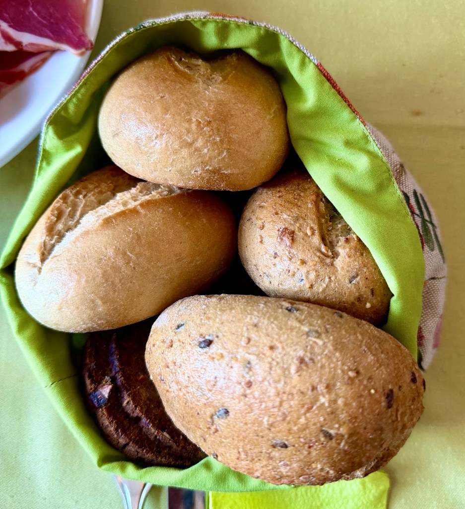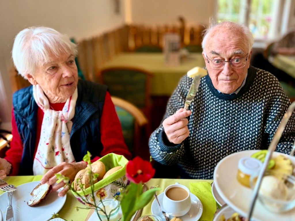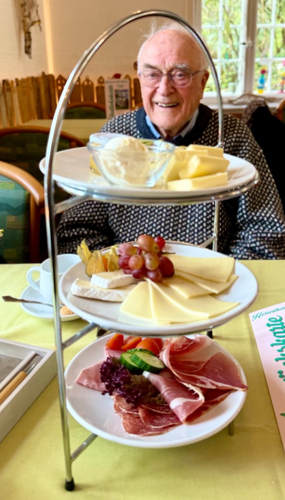 In the morning Susie and I were invited by Heinrich and Elke to Gut Sunder, a former estate of a rich man with a huge central home that is now a hotel and restaurant where all of the employees have mental disabilities. Surrounding the large central buildings is a forest with walkways and several large fish ponds. The main room of the cafe was filled with visitors, one long table being a group of 70 year old women who had arrived from nearby Meisendorf by bicycle. Elke ordered for breakfast two three level trays with assorted cheeses and wursts which came with a basket of brotchen and scrambled eggs and coffee along with a fruit bowl. We had a wonderful relaxed time. It was more than we could eat and we brought some of it back to our apartment.